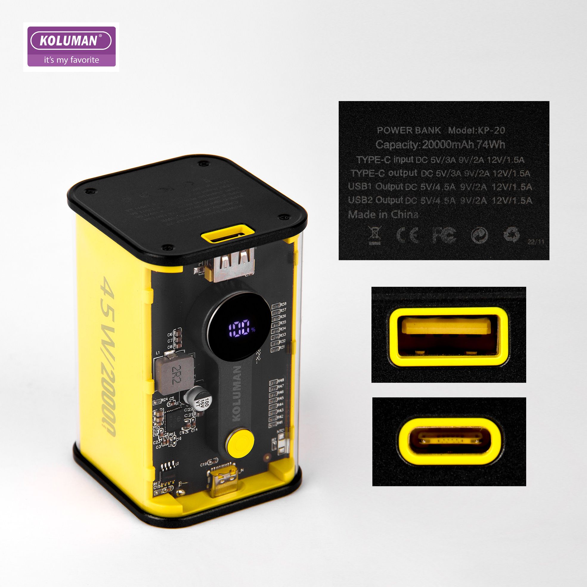 پاوربانک شیشه ای KP-20 تولید شرکت کلومن از یک باتری لیتیومی با ظرفیت 20000 میلی آمپر ساعت بهره میبرد. این پاوربانک 200 گرم وزن دارد . با داشتن این پاوربانک دیگر بابت تمامشدن شارژ باتری گوشی موبایل، تبلت، دوربین دیجیتال و لوازمی از این قبیل نگرانی نخواهید داشت؛ زیرا میتوانید در هر شرایطی بدون نیاز به پریز برق، باتری گوشی موبایل یا دیگر لوازم سازگار با این محصول را تنها با استفاده از یک کابل USB یا PD شارژ کنید. در ساخت این دستگاه از تکنولوژی شارژ سریع Quick Charge 3.0 استفاده شده است. پشتیبانی از شارژ سوپر فست به این معنی است که باتری دستگاه شما با کمک این پاوربانک سریعتر از شارژرهای معمولی شارژ خواهد شد. البته باید توجه داشته باشید که تکنولوژی شارژ سریع تنها با دستگاههای دارای استاندارد شارژ سریع و با کابل مناسب ممکن است و در دستگاههای معمولی امکان استفاده از این تکنولوژی وجود ندارد. شدت جریان خروجی در این شارژر همراه با توجه به ولتاژ خروجی آن، متفاوت است. زمانی که ولتاژ خروجی در این محصول 4.5 تا 5 ولت باشد، شدت جریان خروجی 3 تا 4.5 آمپر است. این در حالی است که اگر ولتاژ خروجی در این محصول 6 تا 9 ولت باشد، شدت جریان خروجی برابر با 2 آمپر خواهد بود. در حالت سوم و زمانی که ولتاژ خروجی 9 تا 12 ولت باشد، شدت جریان خروجی برابر با 1.5 آمپر است. در مورد شدت جریان ورودی این محصول نیز باید بدانید که اگر در حالت عادی ولتاژ ورودی در آن 5 ولت باشد، شدت جریان ورودی4.5 آمپر خواهد بود . در حالت شارژ سریع ولتاژ خروجی این دستگاه (5V ⎓4.5A) است. شما میتوانید وضعیت شارژ باتری KP-20 را از طریق صفحه نمایشگر LED روی بدنه به صورت درصدی مشاهده کنید. بدنهی این محصول شیشه ای میباشد و طراحی آن به دلیل ابعاد کوچک به راحتی قابل حمل میباشد.توان کلی این دستگاه تا 45 وات میباشد و این دستگاه مجهز به فناوری PD نیز میباشد .این پاوربانک را میتوانید با کابل تایپ سی شارژ کنید .