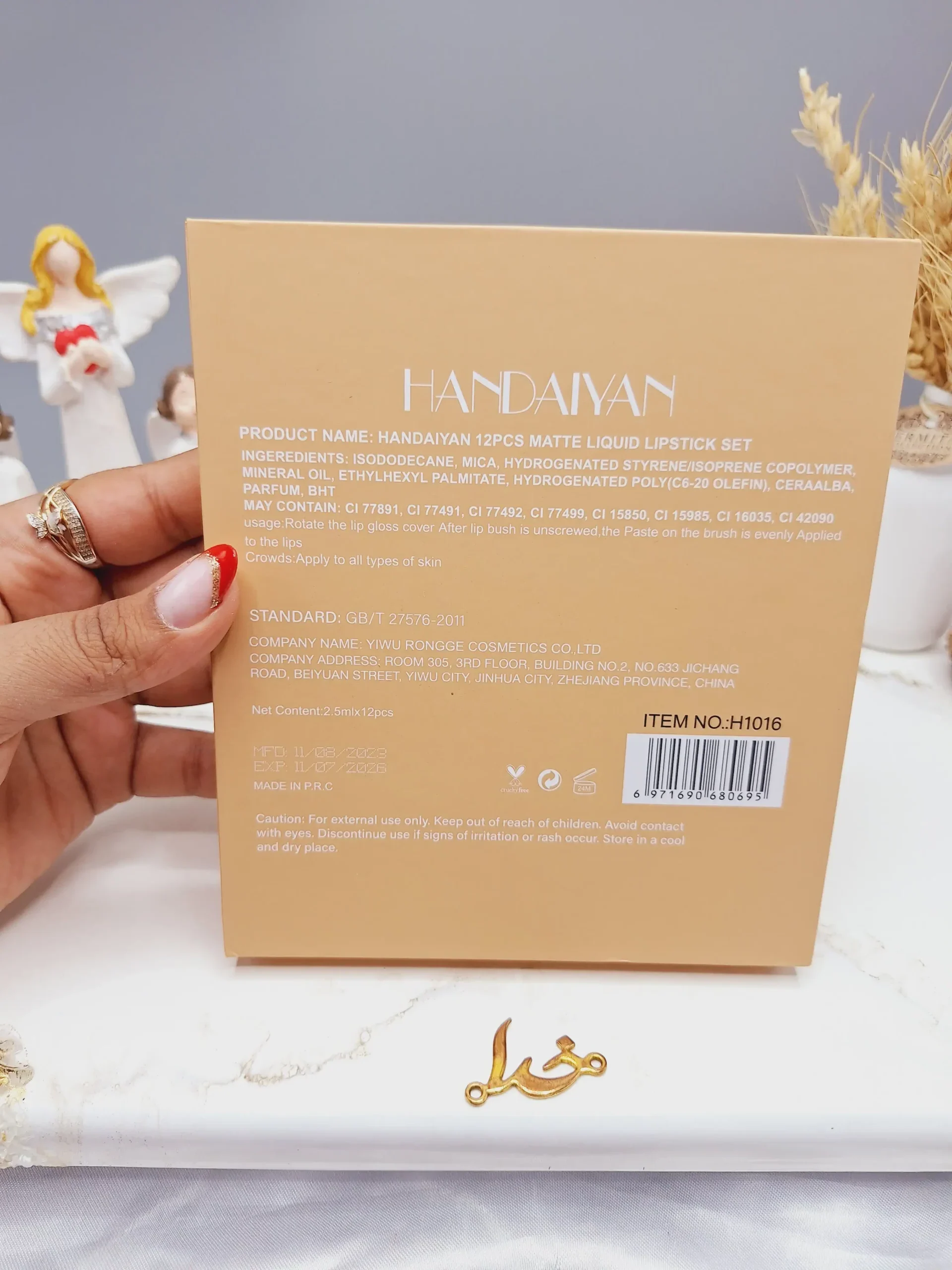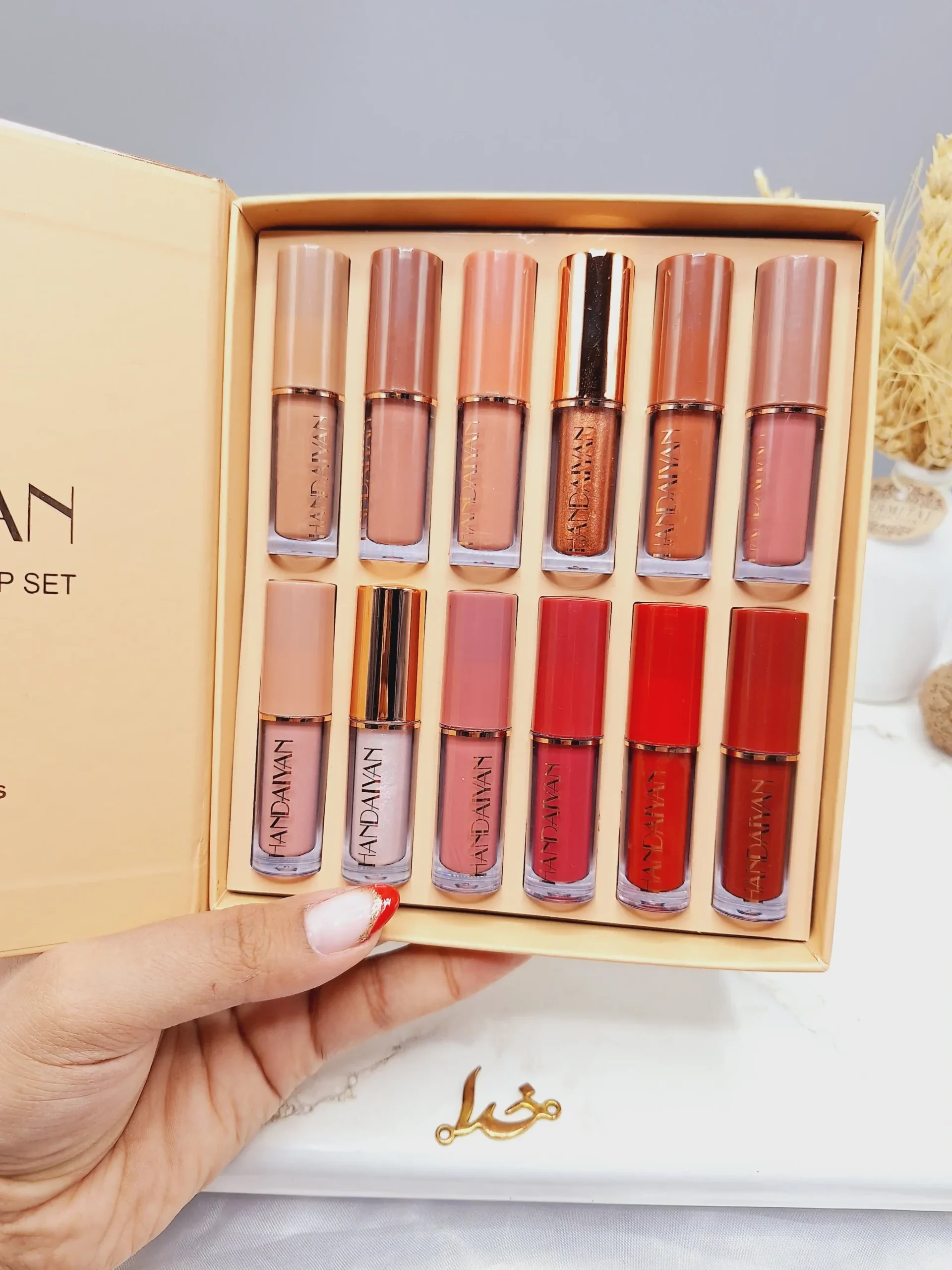 پک رژ لب مایع ۱۲ عددی HANDAIYAN؛ رنگهای جذاب، پوشش مات و مخملی با ماندگاری طولانی و مناسب هدیه یا استفاده روزانه.